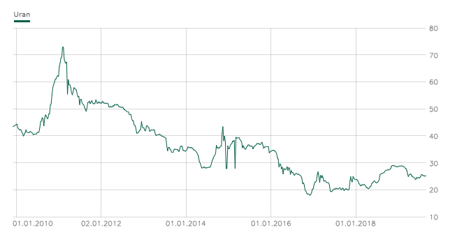 Der GAU in Fukushima im Jahr 2011 setzte dem Uranmarkt schwer zu. Kostete ein Pfund Uran vor dem schweren Unfall in Japan noch rund 70 Dollar, ging es danach im Trend abwärts. Ende 2016 lag der Preis für ein Pfund Uran bei nur noch rund 18 Dollar und erreichte damit wohl ein langfristiges Tief. Zu diesem Zeitpunkt konnten etwa 95 Prozent der Uranminen nicht mehr rentabel produzieren.