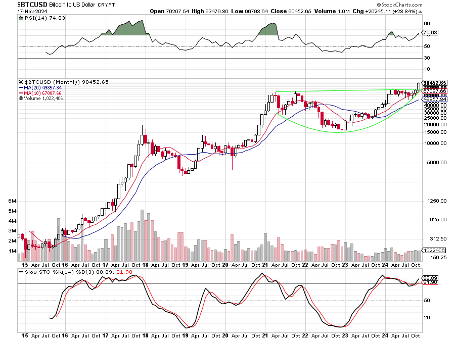 Während die US-Aktien nach der Euphorie durch Trumps Triumph zuletzt wenig Pep zeigen und etwa die Halbleiteraktien mit einem tieferen Tief irritieren (deshalb besser abseits bleiben), feiert Bitcoin eine Börsenparty. Der Krypto-Krösus ist nach dem Vorbild von Gold Anfang März 2024 aus einer langen Tasse-Henkel-Formation nach oben ausgebrochen. 100.000 Dollar wirken nun wie ein Magnet, werden wohl erreicht – aber kaum im ersten Anlauf überboten. Das Wikifolio Krypto Minen hat sich binnen zwei Monaten im Kurs verdoppelt und erhielt am 10.11. das Prädikat „Highperformer.“ https://www.wikifolio.com/de/de/w/wf0kryptop