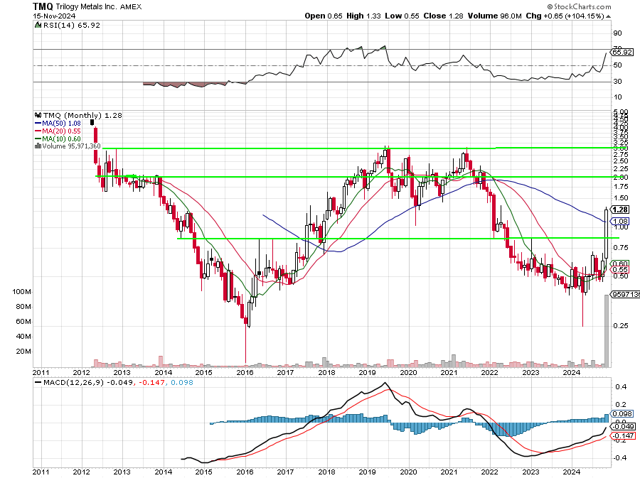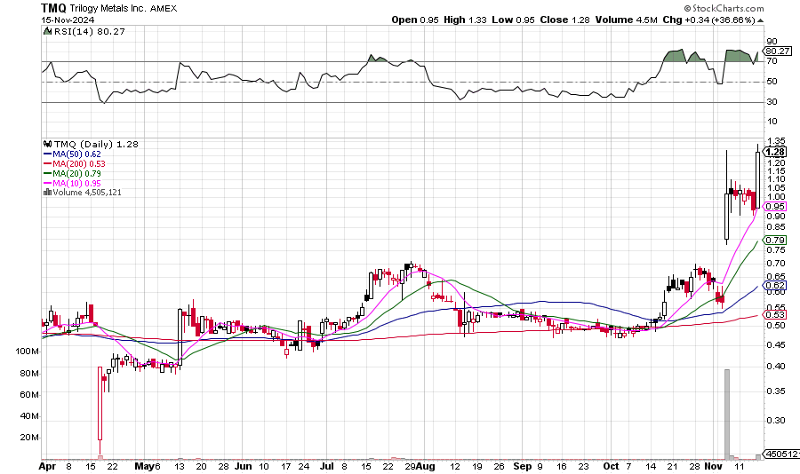 Um den US-Wahltermin starrten die Börsianer und Youtube-Schreihälse vereint auf die Trump-Aktie DJT. Übersehen wurde regelmäßig die Aktie, die am meisten von einem republikanischen Wahlsieg profitieren dürfte. Es ist Trilogy Metals (TMQ). Das Unternehmen besitzt 50 Prozent eines der besten unerschlossenen Kupferprojekte der Welt und hatte an der Börse eine sehr niedrige Bewertung, da eine wichtige Genehmigung vom Biden-Justizministerium ausgesetzt wurde. Hätte Harris die Präsidentschaft gewonnen, wäre die Aktie für mindestens vier Jahre weiter „totes Geld“ gewesen. Mit Trumps Sieg hat der Titel beste Chancen, zu einem der interessantesten langfristigen Kupferwerte oder vom Joint-Venture-Partner South32 übernommen zu werden. TMQ hatte zusammen mit South32 ein vollständig genehmigtes Projekt in Alaska, das von den lokalen Gemeinden und dem Staat Alaska unterstützt wurde, bis das Justizministerium der Biden-Administration intervenierte und das Projekt 2022 stoppte. Ein neu gestaltetes Justizministerium unter Trump wird sehr wahrscheinlich die Fortsetzung des Projekts erlauben. Der Aktienkurs lässt daran keinen Zweifel.