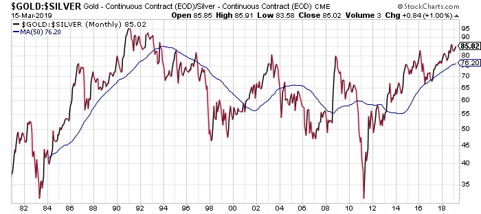 Der erste Chart zeigt, dass Gold im Verhältnis zu Silber nahe am Hoch der letzten 30 Jahre steht. Damit ist klar, dass Silber momentan sehr billig im Vergleich zu Gold notiert. Das kann auch noch etliche Monate oder ein Jahr so bleiben. Wer heute aber Edelmetalle kauft und diese vier, fünf oder mehr Jahre halten will, favorisiert Silber über Gold.