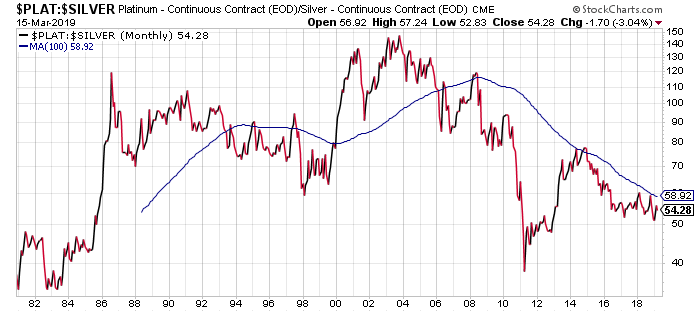 Platin ist extrem billig im Verhältnis zu Gold und auch günstig im Vergleich zu Silber. Das wird durch den zweiten Chart oben untermauert.