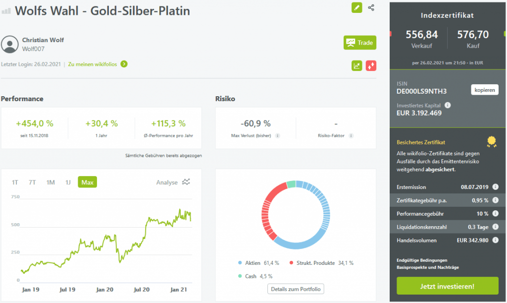 Besonders bei den beiden Wikifolios mit Hebelprodukten ging es in der zweiten Februarhälfte „rund“. Während das Flaggschiff Wolfs Wahl – Gold-Silber-Platin dank vielen und sehr gut laufenden Energie- und Rohstoffwerten sein hohes Niveau verteidigen konnte, wurde Wolfs spekulative Witterung durch den Goldpreissturz am Freitag deutlich zurückgeworfen. Das spekulative Wikifolio notiert neun Prozent über dem Startkurs und ist hier für Hartgesottene interessant.
