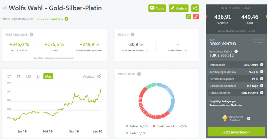 Quelle: Performance-Report für das Wikifolio Wolfs Wahl – Gold-Silber-Platin