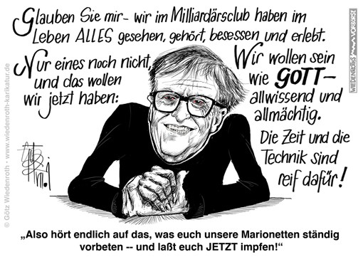 Halten Sie sich immer das große Bild vor Augen und blenden Sie den täglichen Informationsmüll weitgehend aus. Normalerweise würden wir jetzt in einem traditionellen Krieg stecken, denn dies ist der Standard-Vorwand, um in einem überschuldeten System die Geldschleusen zu öffnen. „Die Pandemie“ ist der Deckmantel für die laufende Geldflut, die vom Volk in normalen Zeiten nie akzeptiert würde. Also tobt ein verlogener Krieg gegen ein Virus, das zum Feind, zur monströsen Bedrohung aufgeblasen wird, um die Bürger in Angst und Schrecken zu versetzen, ihre Rechte einzukassieren sowie demokratische Grundprinzipien abzuschaffen. Tatsächlich sind die Bürger in diesem neuartigen Krieg der Feind, nicht etwa ein Virus. Verantwortungslose, erpresste, gekaufte Politiker eliminieren unsere Grundrechte und verkünden frech, „die bekommt ihr (teilweise) zurück, wenn ihr euch ‚impfen‘ lasst.“ Mit „Impfstoffen“, die den Namen nicht verdienen, da sie keine reguläre, sondern lediglich eine Not(fall)zulassung besitzen. Erst 2023 sollen die Studien zu den Auswirkungen der Möchtegern-Impfstoffe abgeschlossen werden.
