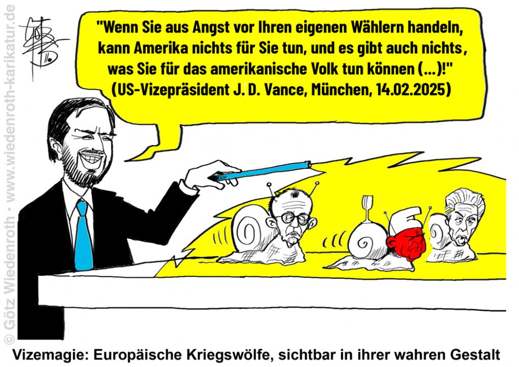 Falls Ihnen als weiteres kriegerisches Puzzle-Teil der voraussichtliche nächste deutsche Bundeskanzler in den Sinn kommt, kann man schwer dagegen argumentieren. Unverdrossen setzten und setzen viele Deutsche (ihre Hoffnungen) auf den frisch gewählten und forsch agierenden selbsternannten Heilsbringer aus den USA. Hoffnung kann nicht schaden, aber leicht enttäuscht werden, besonders wenn man als Kind zu viele Märchen gehört und gelesen oder später Hollywood-Filme konsumiert hat. Und den dortigen Slogan MAKE AMERICA GREAT AGAIN nicht verstehen will. Der soll nämlich umgesetzt werden, indem andere schrumpfen. Also WIR als großer wirtschaftlicher Konkurrent. Trump hat – verständlicherweise – keine freundschaftlichen Gefühle für Deutschland und wird mit seiner Politik unsere wirtschaftliche Talfahrt forcieren. Zudem gießt er im Nahen Osten Öl ins Feuer und darf gerade feststellen, dass die USA funktional bankrott sind, was zu einem harten Reset des auf Schulden basierenden Systems führen wird. Der US-Präsident macht Politik für Amerika – eine Selbstverständlichkeit, die bei uns schon nicht mehr verstanden wird. Sein Vize Vance hat auf der Münchner Sicherheitskonferenz klare Worte gesprochen und keinen Applaus erhalten. Es entbehrt nicht der Ironie, wenn die angeblich Befreiten von einem ihrer Befreier aus ihrer Traumwelt befreit werden….