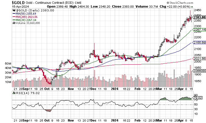 Meine Leser möglichst heil und ungerupft durch die turbulenten nächsten Jahre zu navigieren, ist der Anspruch dieses Formats. Hinweise zum pekuniären Überleben kann ich Ihnen an dieser Stelle geben, Ihren persönlichen Schutz (wie Standortwahl etc.) sollten Sie selbst organisieren und optimieren. Allem geopolitischen Sperrfeuer zum Trotz hat die pekuniäre Notwehr zuletzt famos funktioniert. Im Beitrag vom 27. März – bei einem Goldpreis von 2200 Dollar – stand in der Überschrift „Nächstes Ziel 2400“ und anschließend im Text „Ein Goldpreis von 2400 bis 2500 Dollar im ersten Halbjahr 2024 ist erreichbar und wahrscheinlich.„ Bereits am letzten Freitag (12. April ) erreichte die Goldunze ein Allzeithoch von 2432 Dollar.