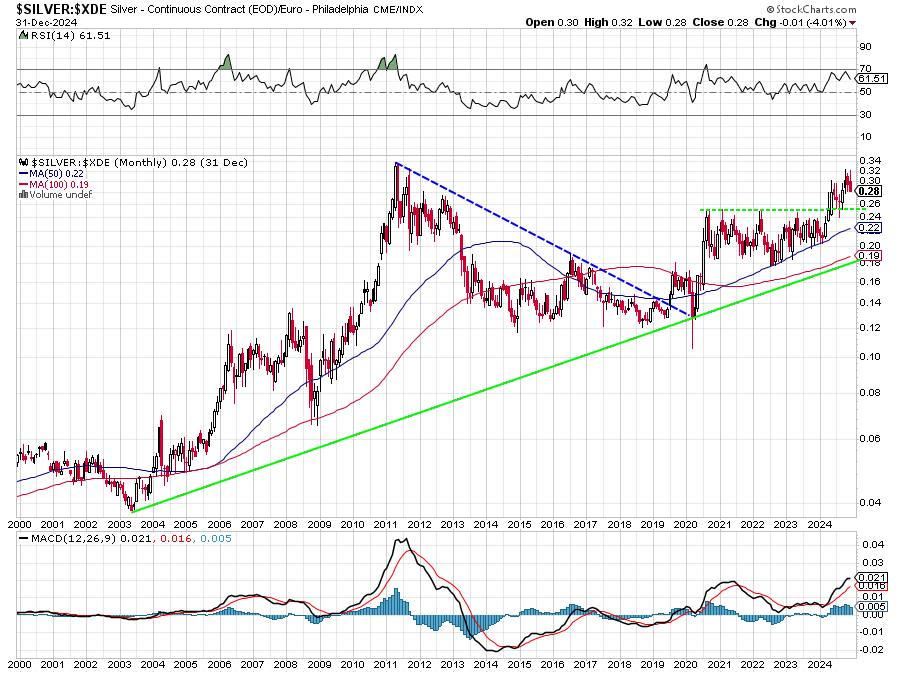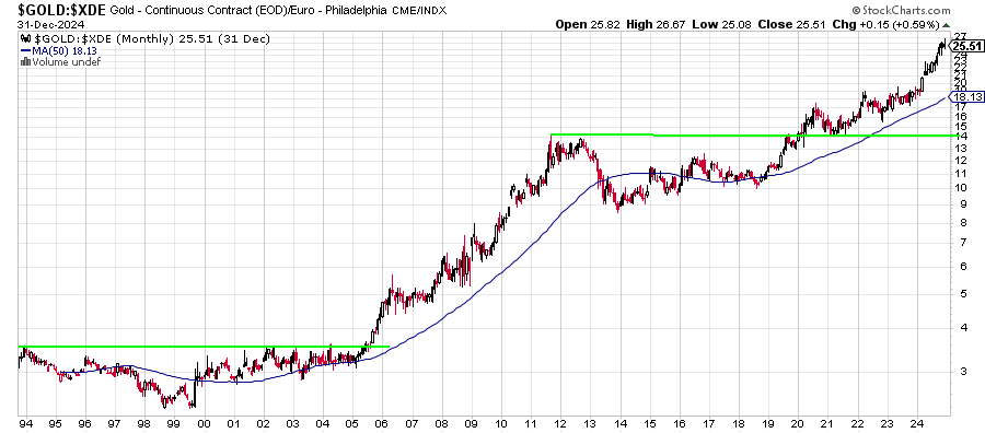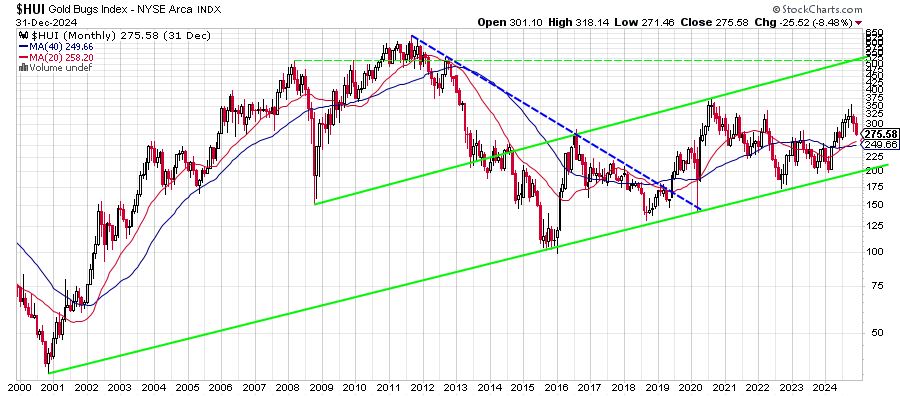 Für die Anleger und ihren Erfolg bleibt entscheidend, den Überblick zu bewahren und die entscheidenden Wegmarken nicht aus den Augen zu verlieren. Dazu gehört, das 7-Jahrestief zwischen September und November 2022 als solches zu erkennen. Eindeutig zeigt es sich beim Gold-, Silber- und Platinpreis sowie den führenden Minen-Gradmessern – dem ETF GDX und Arca Gold Bugs Index (HUI). Der Ausbruch aus der jahrelangen Konsolidierung erfolgte beim Goldpreis Anfang März 2024. Gold ist in dieser Edelmetallhausse eindeutig der zyklische Treiber und Vorreiter. Seinem Beispiel werden im neuen Jahr 2025 Silber sowie die Minen folgen und nach oben ausbrechen. Bislang besteht noch zu wenig Interesse für die Titel der Goldförderer, da der normale Aktienmarkt seinen säkularen Bullenanstieg nicht beendet hat.