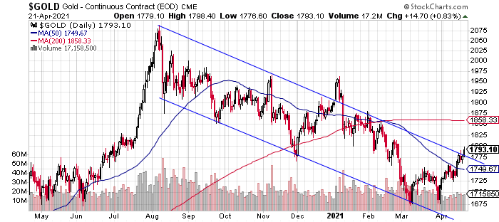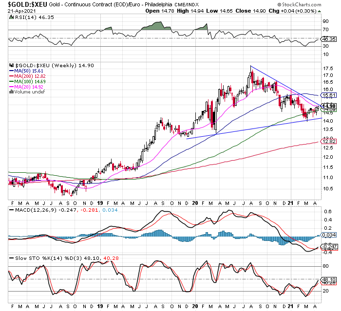 Während die meisten Marktkommentatoren und Anleger noch pessimistisch und reserviert sind, ist es ratsam, die günstigen Kurse antizyklisch zum Kauf zu nutzen. Gold und Silber samt Minenaktien haben das Zeug zu einer Kursexplosion, denn eine zehnjährige Tasse-Henkel-Formation scheint kurz vor der Vollendung zu stehen, was extrem bullishe Implikationen hat. Bei den Minen ist das Tief bereits Anfang März zu erkennen, sie sind damit klassisch Vorläufer, seitdem verzeichnen sie höhere Hochs und Tiefs, sowohl die 50- als auch die 100-Tage-Durchschnittslinien wurden überwunden, der Goldminen-ETF GDX hat gerade den Abwärtstrend seit dem Hoch Anfang August 2020 geknackt. Trendlinienbrüche sind auch beim Silber zu erkennen, gestern wurde auch hier nach Gold und den Minen die wichtige 50-Tage-Linie übersprungen. Die Royalty-Aktien und Wegweiser Franco-Nevada und Wheaton Precious Metals zeigen seit Anfang März relative Stärke.