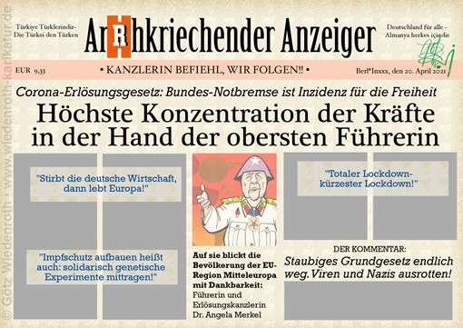 Früher wurde die Presse gleichgeschaltet, heute erfolgt die Gleichschaltung überwiegend freiwillig in vorauseilendem Gehorsam. Diese verantwortungslos totalitäre Regierung benötigt eigentlich gar kein Bundespresseamt, denn die meisten Journalisten liegen brav an der Leine – und der Bürger im Zangengriff von „Mutti“ und ihren willigen Helfern in den Medien zunehmend wie ein Hofhund an der Kette. Kritik kommt schon gelegentlich von einigen wenigen aufrechten Pressevertretern, aber diese können (und wollen?) sich nicht vorstellen, dass die frühere „FDJ-Sekretärin für Agitation und Propaganda“ mit voller und böser Absicht gegen Deutschland und die Deutschen agiert. So schreibt Ulrich Reitz im Focus: „Dieses Gesetz führt uns in den Corona-Absolutismus“ mit einer drastischen Einschränkung von Grundrechten. Und: „Die Bundesregierung hält sich ein Parlament – es sollte umgekehrt sein.“ Zum Ende seines Artikels bemüht er das Prinzig Hoffnung: „Hoffentlich kommt Merkel mit diesem Akt der Machterweiterung nicht durch.“ Wenn die ehrbare Welt-Reporterin Susanne Gaschke schreibt: „Der Bundestag muss dem Corona-Wahnsinn des Kanzleramtes Einhalt gebieten,“ bleibt dies leider auch nur ein frommer Wunsch. Ihr Titel „Die Bundesregierung hat den Bezug zur Wirklichkeit verloren“ verkennt, dass Merkel & Konsorten eine neue Realität erzwingen wollen.