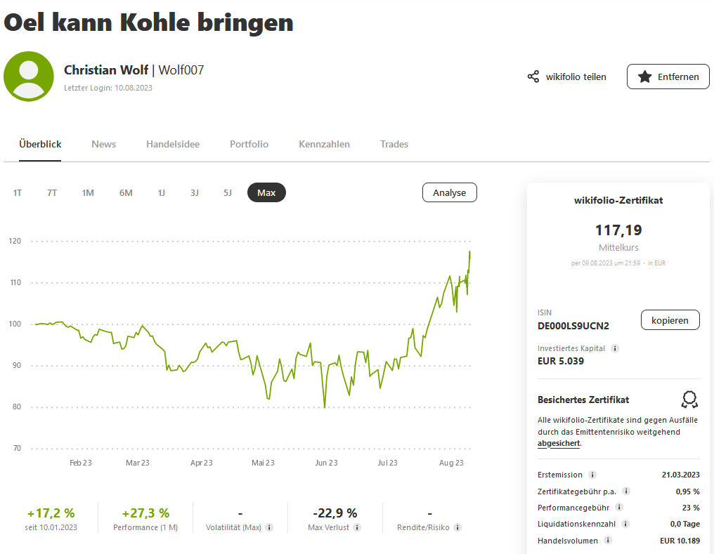 Kurz bevor das Wikifolio richtig in Fahrt kam, sind die meisten Anleger ausgestiegen. „Wie so oft“, ist man – nicht nur – versucht zu sagen und zu schreiben. Denn es zeigt wieder einmal die extreme Ungeduld vieler Akteure an den Börsen. Gehört doch Geduld zu den wichtigsten Tugenden in diesem Geschäft. Aber die Emotion ist meist Sieger und der Anleger dann Verlierer. Bei der negativen Stimmung für Öl und Gas im Frühjahr investierte dort nur eine Minderheit, die dann auch noch mehrheitlich nach wenigen Wochen und vor dem starken Anstieg die Flinte ins Korn warf.