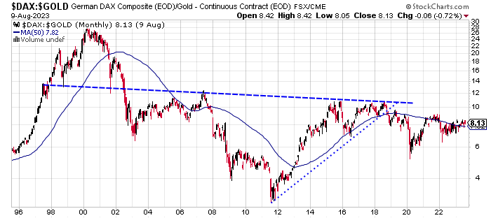 Der (10.) März 2000 ist ein herausragendes Datum, markiert er doch das Hoch der größten Aktienhausse der Weltgeschichte seit ihrem Start im Jahr 1982. Damals toppten DAX und Neuer Markt, letzterer verschwand, während die 8000 DAX-Punkte vom 10. März 2000 bis heute nicht übertroffen wurden, wenn man sich die Mühe macht, real zu denken und zu rechnen, also die Inflationsrate einbezieht oder den DAX in Gold statt in Euro ausdrückt. In den nächsten 12 bis 18 Monaten wird der Chart weiter kräftig nach Süden rauschen, also der DAX gegenüber Gold ordentlich Federn lassen.