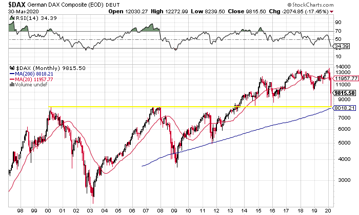 Die entscheidenden Trendwenden bei deutschen Aktien in den letzten 20 Jahren drängeln sich um die Märzmitte. Das inflationsbereinigt unverändert gültige Allzeithoch des Dax fällt auf den 10. März 2000. Dann ging es drei Jahre auf die Rutschbahn bis zum Tief am 12. März 2003. Nach der Finanzkrise im Jahr 2008 markierten deutsche Aktien ihren Tiefpunkt am 9. März 2009. Und wann zeigte sich im laufenden Jahr der Dax am stärksten infiziert? Am 16. März!