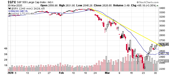 Diese läuft gerade und ist an einem wichtigen Punkt angekommen. Hierfür bemühen wir den meistbeachteten US-Index S&P 500, der sich per 30. März bis zu seiner Abwärtstrendlinie erholt hat.