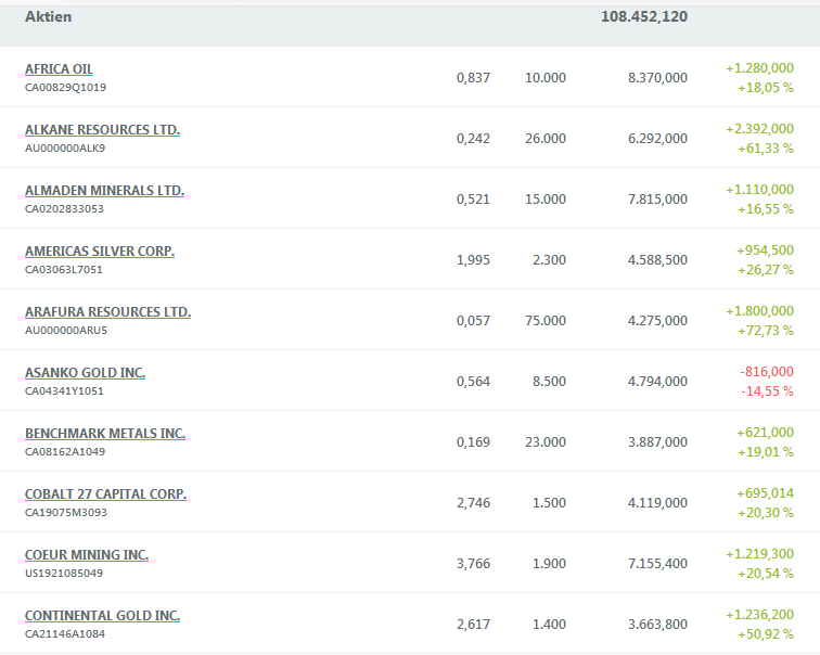 Mein Depot enthält zwar Optionsscheine und andere Hebelprodukte, hat aber keineswegs die rein kurzfristige Gewinnmaximierung zum Ziel. Das erkennen Sie daran, dass ich eine Reihe von Aktien mit geringer Marktkapitalisierung halte, die mein Ergebnis durch ihren hohen Spread zwischen An- und Verkaufskurs sofort beim Erwerb belasten. Dies ist der erste Grund, warum ich Ihnen vom Kauf dieser Titel für Ihr privates Depot abraten muss. Für das Wikifolio habe ich dennoch zugegriffen, denn diese Aktien konnten sich in den ersten acht Monaten des Jahres 2016 verfünf- bis verzwanzigfachen.