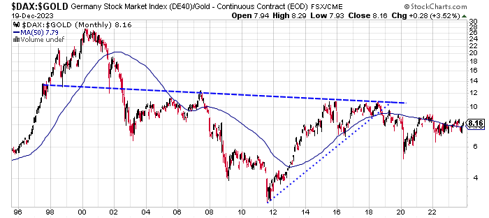 Der Chart zeigt den DAX in Gold statt in Euro berechnet. Und da offenbart sich eine miserable Performance deutscher Aktien im Vergleich zum Gold als langfristigem Wertspeicher seit nunmehr 24 Jahren. Im nächsten Jahr wird der DAX gegenüber Gold weiter Federn lassen. Und das nicht nur, weil 2024 das 4-Jahrestief bei den Aktienmärkten fällig ist.