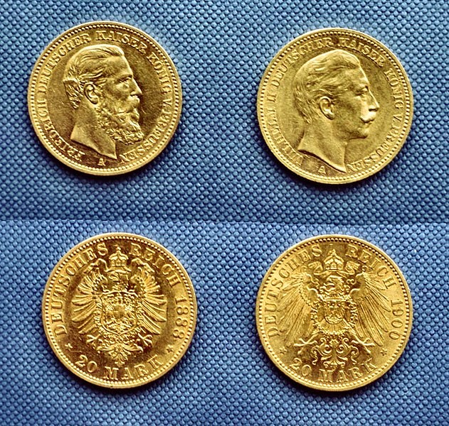 Keinen Hehl mache ich daraus, die Münzen des Kaiserreiches zu schätzen. Mit der Reichsgründung 1871 wurde eine einheitliche deutsche Währung geschaffen. Diese Währungsunion hatte mit der heutigen Sch(w)undwährung Euro gar nichts gemein. Denn damals wurde die goldgedeckte Mark als „Reichsgoldwährung“ eingeführt. Auf 0,358423 Gramm Feingold wurde der Gegenwert einer Mark festgesetzt, Kurantmünzen – also Umlaufmünzen – in Gold und Silber geprägt. Allein im Auftrag Preußens prägte man zwischen 1871 und 1914 rund 196 Millionen 20-Mark-Goldstücke. Die 20 Mark von Wilhelm I. (Jahrgang 1871 bis 1888) und Wilhelm II. (Jahrgang 1888 bis 1913) von Preußen sind dennoch auch für Sammler, besonders aber für Goldanleger interessant, die niedrige Aufpreise schätzen. Beide Goldmünzen gibt es nur mit einer 900er-Feinheit bei einem Goldgehalt von 7,168 Gramm.