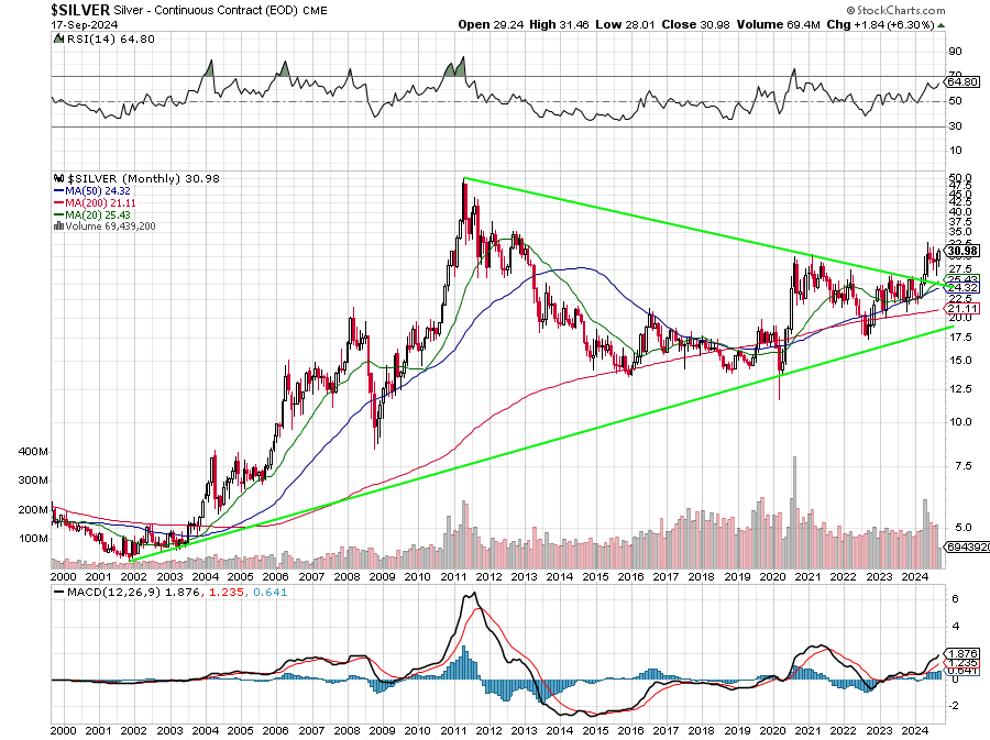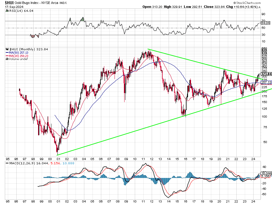 Aktien, Währungen und Edelmetalle fluktuierten nach der Zinsentscheidung stärker, zeigten jedoch final keine Trendumkehr. Mit Ausnahme des Dollars steigt im heutigen Tagesverlauf alles. Mein Kommentar in den Wikifolios am 12. September bleibt gültig: „Gold und besonders Silber stehen vor einem starken Preisausbruch nach oben. 2700-2800 und 35-40 Dollar sind das nächste Zwischenziel. Behalten Sie das große Bild im Auge. Bei den Edelmetallen haben wir es mit multiplen Ausbrüchen aus langjährigen Formationen zu tun. Die Tagesschwankungen dienen nur dazu, die Anleger zu verwirren, zu frustrieren und abzuschütteln – wie in den letzten Wochen. Silber und die Minenaktien haben großen Nachholbedarf gegenüber Gold, wenn das führende Edelmetall Richtung 2800 Dollar strebt. Ich erwarte, dass das Gold-Silber-Verhältnis in den Bereich von 70:1 fallen wird. Dies bedeutet einen Silberpreis von 40 Dollar – wahrscheinlich vor dem Jahresende.„