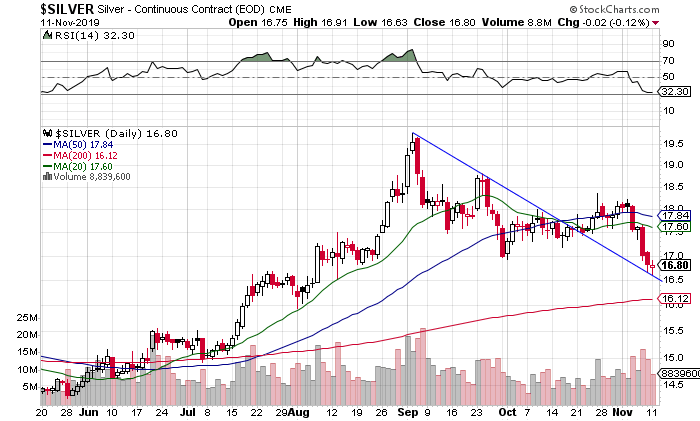 Sehr ungewöhnlich und ermutigend ist das Verhalten der Goldminen. Die bekanntesten Indizes HUI und XAU zeigen sich widerstandsfähig gegen den fallenden Goldpreis und haben ihre Oktobertiefs auch nicht unterboten. Das kann zwar noch passieren, ist aber ein wichtiges Indiz dafür, dass die Korrektur kurz vor ihrem Ende steht.