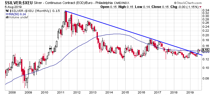 Neben den Negativzinsen liefert der Dollar aktuell den wichtigsten Grund für steigende Edelmetallpreise. Er hat einen charttechnischen Fehlausbruch nach oben hingelegt und fällt nun. Reichlich risikolos können Sie Donald Trump vertrauen, dass der Dollar weiter Federn lässt. Mit einer schwachen Währung und fallenden amerikanischen Zinsen will der US-Präsident die heimische Konjunktur auch beim Export anheizen. „America first“ ist bei ihm nicht nur eine Sprechblase. Es spricht alles dafür, dass Trump seinen Willen auch gegen den zerstrittenen Hühnerhaufen EU durchsetzen wird. Dann gilt die gewohnte Gleichung: schwacher Dollar = starkes Gold.
