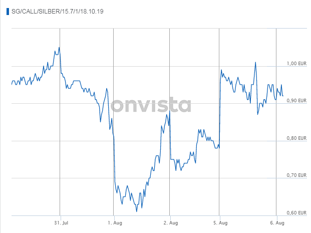 Tatsächlich wurde so der Silber-Optionsschein mit der WKN SR18TN nahe Tagestief bei 0,63 Euro am 1. August gekauft. Zwei Handelstage später notierte er in der Spitze um 60 Prozent höher bei 1,01 Euro.