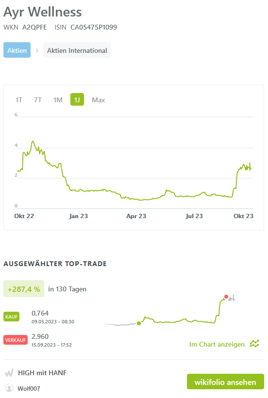 Mein Verkauf der Ayr Wellness mit 287 Prozent Gewinn in 130 Tagen wurde von Wikifolio als Top-Trade gewertet.